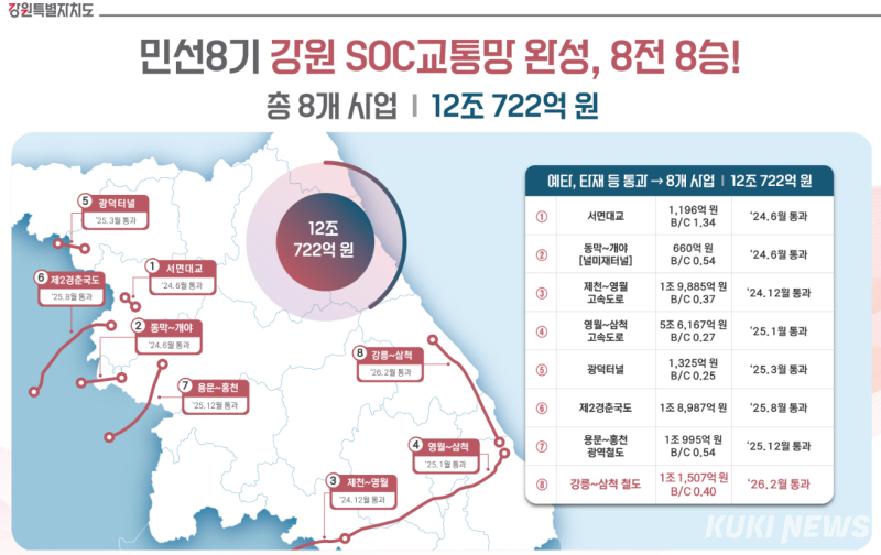 김진태 강원특별자치도지사는 "민선 8기 들어 대형 SOC 8번째 성과로 8전 8승의 기록을 세우게 됐다"라며, "이를 모두 합치면 약 12조 원 규모로 사통팔달 수도권 강원시대를 여는 중요한 전환점이 될 것"이라고 강조했다.