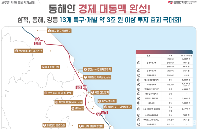 또한 "강릉·동해·삼척 13개 특구 개발사업 3조 원과 연계한 시너지 효과는 물론, 울산·경북·강원에 분산된 6개 주요 수소거점을 연결하는 수소산업 벨트와 동해안 117개 해수욕장을 기반으로 한 글로벌 관광벨트 조성에도 큰 역할을 할 것"이라고 덧붙였다.