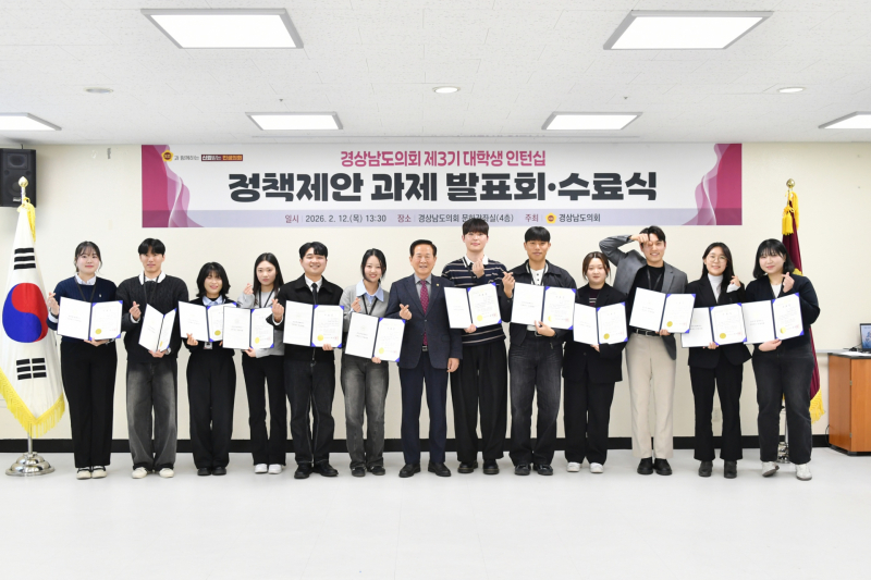 수료식에는 박인 부의장이 참석해 인턴 12명에게 수료증을 전달했다. 박 부의장은 “청년의 참신한 시각을 확인한 뜻깊은 시간이었다”며 “인턴십을 마친 청년들이 경남을 이끌 미래 인재로 성장하길 기대한다”고 말했다.