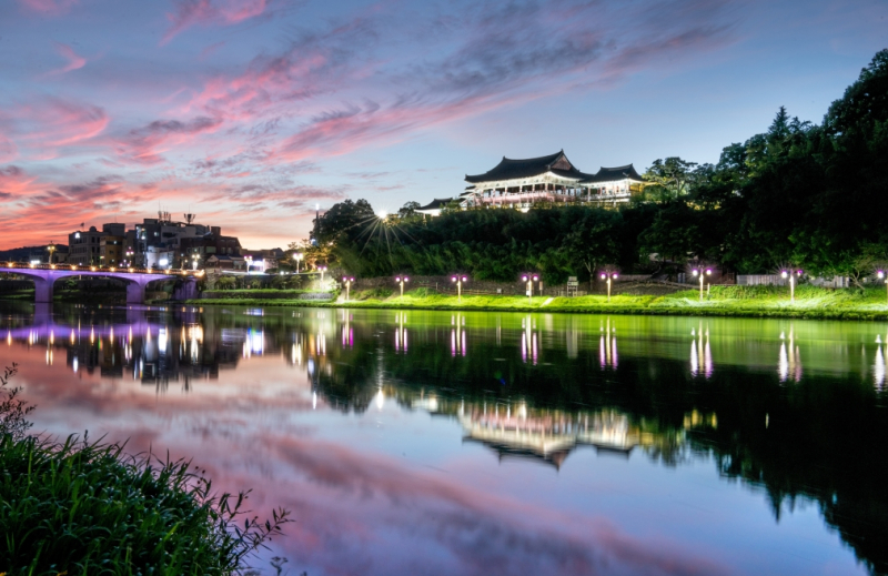 영남루는 조선시대 대표 누각으로, 야간에는 건너편 밀양강 둔치에서 조명이 비친 누각을 조망하는 것이 매우 아름답다. 조명이 켜진 영남루는 밀양강 수면에 반사돼 마치 한 폭의 그림처럼 도시의 밤을 물들인다. 도심에 위치해 접근성이 좋고, 영남루 야경을 볼 수 있는 밀양강 둔치 수변산책로는 저녁 산책 코스로도 제격이다.