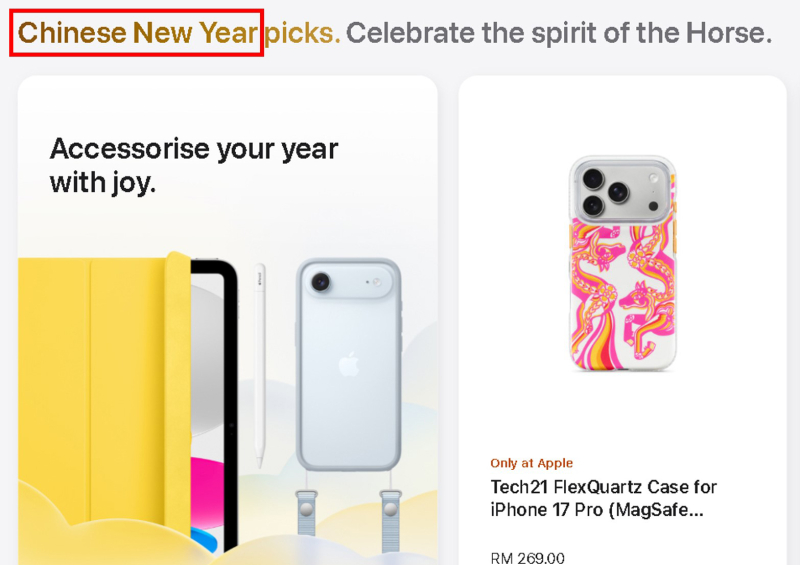 13일 업계에 따르면 최근 애플은 병오년을 맞아 홈페이지에 말을 캐릭터화 한 휴대폰 케이스 등을 선보였다. 이 과정에서 마케팅 문구에 중국설이란 표현을 했다.