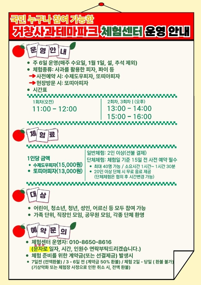 한편 체험 예약과 문의는 사과이용체험센터로 가능하며, 자세한 사항은 거창사과테마파크 누리집에서 확인할 수 있다.