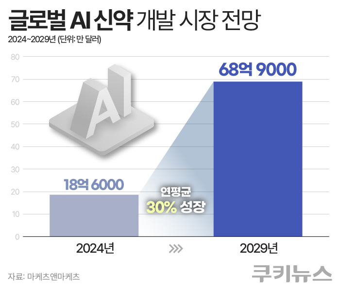 글로벌 시장조사기업 마케츠앤마케츠에 따르면, 글로벌 AI 신약 개발 시장은 2024년 18억6000만달러(한화 약 2조6800억원)에서 2029년 68억9000만달러(약 9조9300억원)로 연평균 30% 성장할 전망이다. 2023년 맥킨지 보고서에선 생성형 AI가 제약과 의료기기 산업에 600~1100억달러(약 86조~158조원)의 경제적 가치를 창출할 것으로 평가됐다.