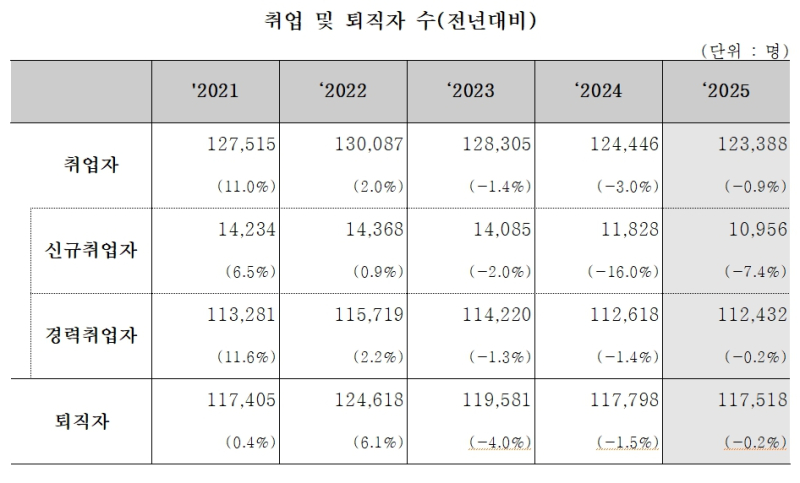 2025년 취업자는 12만3388명으로 0.9% 감소했고, 퇴직자는 11만7518명으로 0.2% 줄었다. 취업자 중 경력취업자는 11만2432명(-0.2%)이었으며 신규취업자는 1만956명으로 7.4% 급감했다.