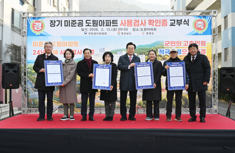 창녕읍 송현리 53번지 도원아파트에서 사용검사 확인증 교부식을 진행하고 있다. 도원아파트는 1991년 주택건설사업계획 승인을 받았으나, 공사 과정에서 사업주체의 부도·파산으로 공사가 중단되며 장기간 미준공 상태가 이어졌다. 이로 인해 입주민들은 사실상 재산권을 행사하지 못한 채 각종 생활 불편을 감내해왔다.