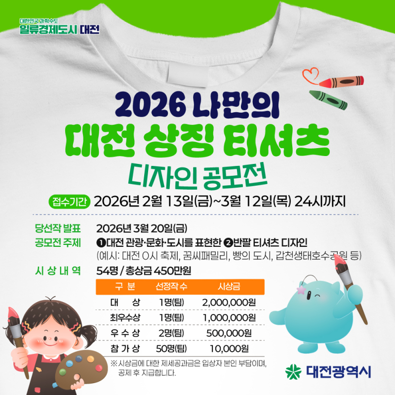 대전시는 대중 소통을 강화하고 시민과 함께 하는 축제를 구현하기 위해 ‘2026 대전 0시 축제 로고 디자인 공모전’과 ‘대전 상징 티셔츠 디자인 공모전’을 개최한다고 밝혔다.