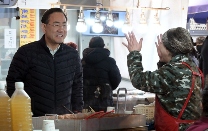 설 명절을 사흘 앞둔 14일, 대구 수성구 신매시장 한 과일가게 상인의 하소연에 주호영(국민의힘) 국회부의장이 깊은 한숨을 내쉬었다.