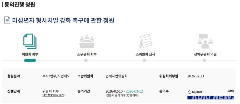15일 오후 7시 국회 전자청원 게시판 확인 결과, ‘미성년자 형사처벌 강화 촉구에 관한 청원’에는 모두 6만 5명이 동의했다.