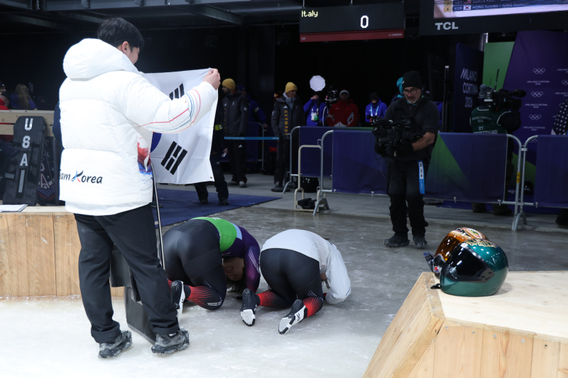 16일(한국시간) 이탈리아 코르티나담페초 슬라이딩센터에서 열린 2026 밀라노·코르티나담페초 동계올림픽 스켈레톤 혼성단체전에서 정승기와 홍수정이 경기를 마친 뒤 큰절을 올리고 있다. 16일(한국시간) 이탈리아 코르티나담페초 슬라이딩센터에서 열린 2026 밀라노·코르티나담페초 동계올림픽 스켈레톤 혼성단체전에서 레이스를 마친 정승기와 홍수정이 태극기를 받고 있다.