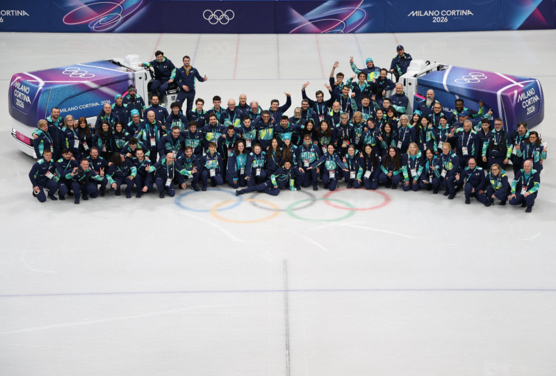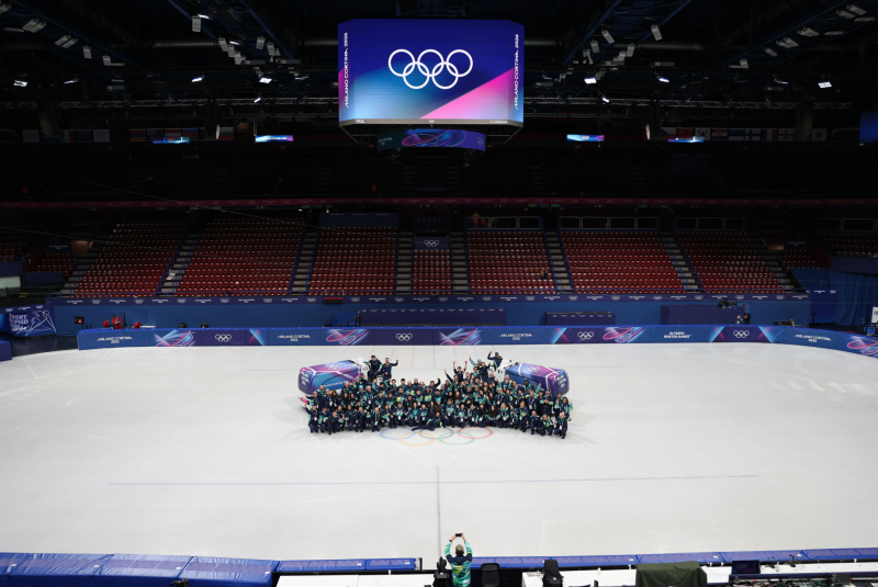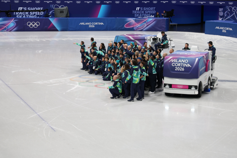 18일(현지시간) 이탈리아 밀라노 아이스스케이팅 아레나에서 열린 2026 밀라노-코르티나담페초 동계올림픽 쇼트트랙 여자 3000m 계주와 남자 500m 경기가 끝난 뒤 자원봉사자들이 기념사진을 찍고 있다.