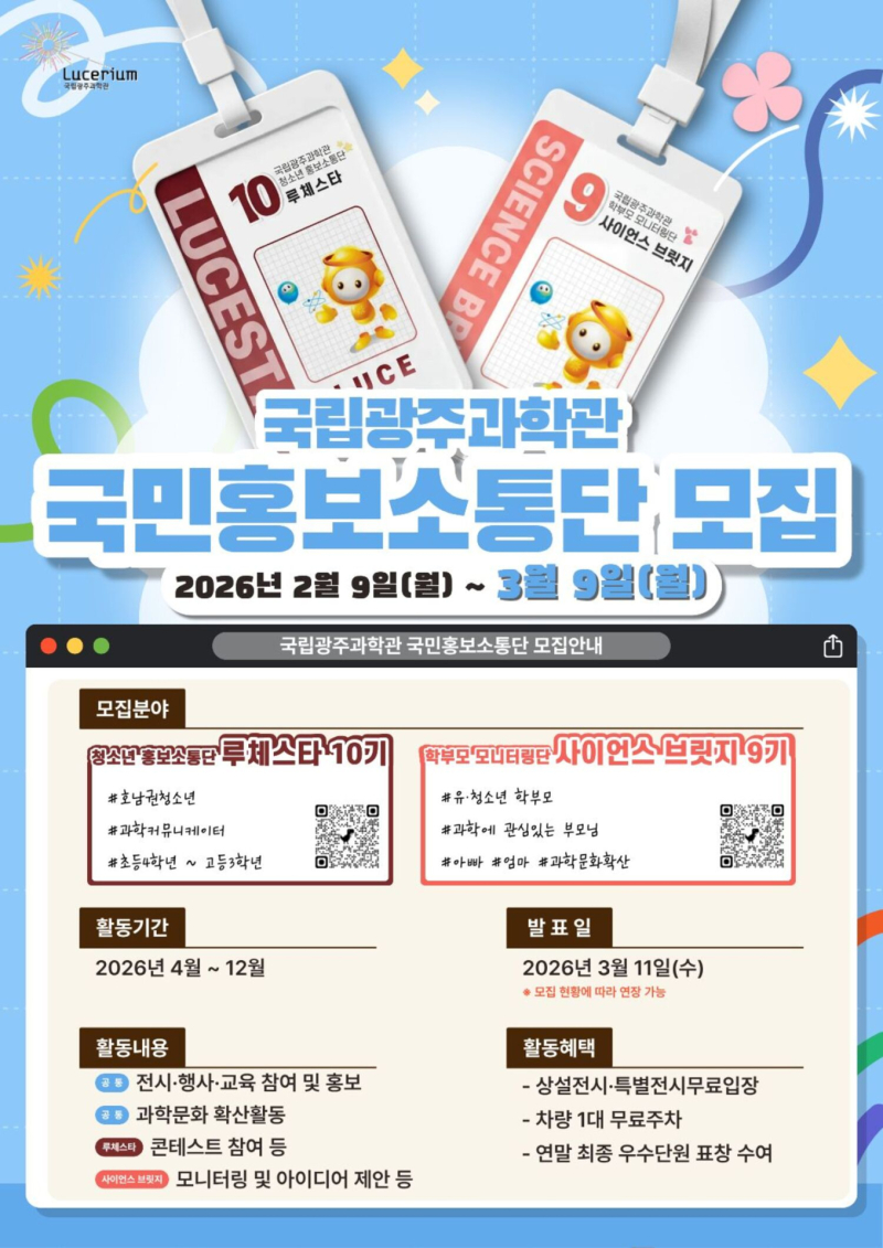 이번 소통단은 과학관의 전문성과 시민의 요구를 연결하는 핵심 창구 역할을 수행한다. ‘루체스타’는 호남권 거주 초교 4학년~고교 3학년 청소년 100명을 대상으로 하며 ‘사이언스 브릿지’는 유아·청소년 자녀를 둔 학부모 30명을 선발해 프로그램 개선과 관람 환경 조성을 위한 의견을 제안받는다. 활동 기간은 오는 4월부터 12월까지 9개월간이다.