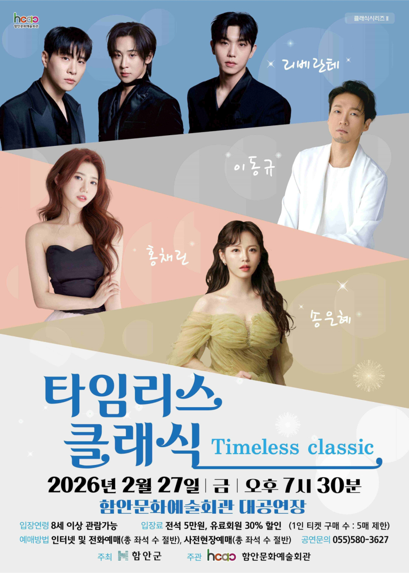 함안군은 오는 27일 함안문화예술회관 대공연장에서 2026년 두 번째 기획공연인 클래식 시리즈Ⅱ ‘타임리스 클래식(Timeless Classic)’을 개최한다.