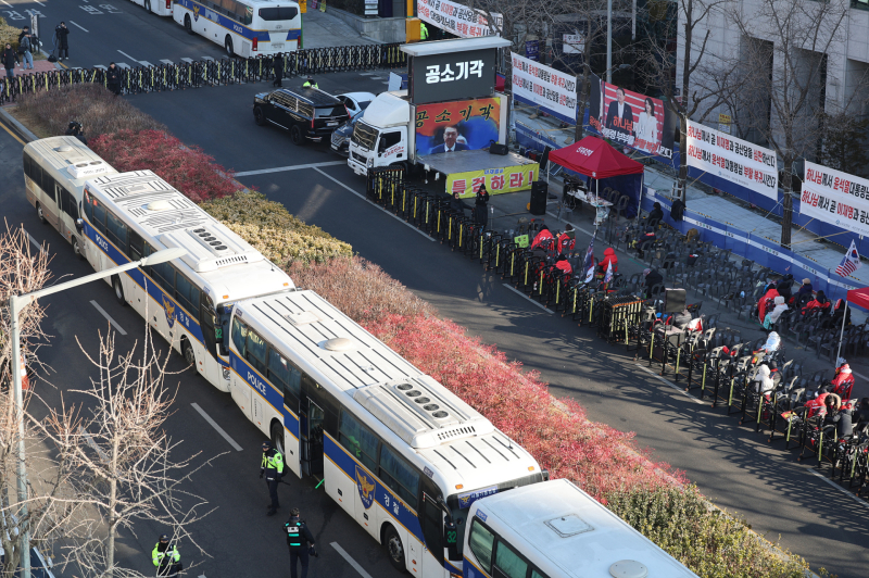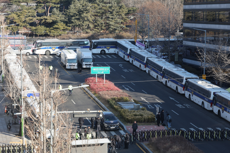 내란 우두머리 혐의로 기소된 윤석열 전 대통령의 1심 선고가 열리는 19일 서초구 서울중앙지방법원 일대가 경찰 차벽으로 둘러싸여 있다.