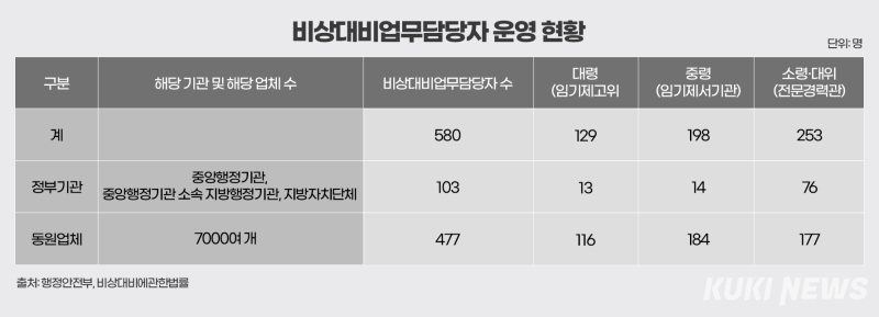 이에 대해 행정안전부 관계자는 “업체의 규모나 임무 중요성을 고려해 비상대비업무 담당자를 지정하고 있다”며 “비상대비업무 인력을 둘 경우 각 업체가 인건비를 부담해야 하기 때문에 정부가 모든 업체에 담당자를 두도록 강제할 수는 없다. 현행 시행령 기준에 따라 담당 인력을 권장하고 있다”고 설명했다.