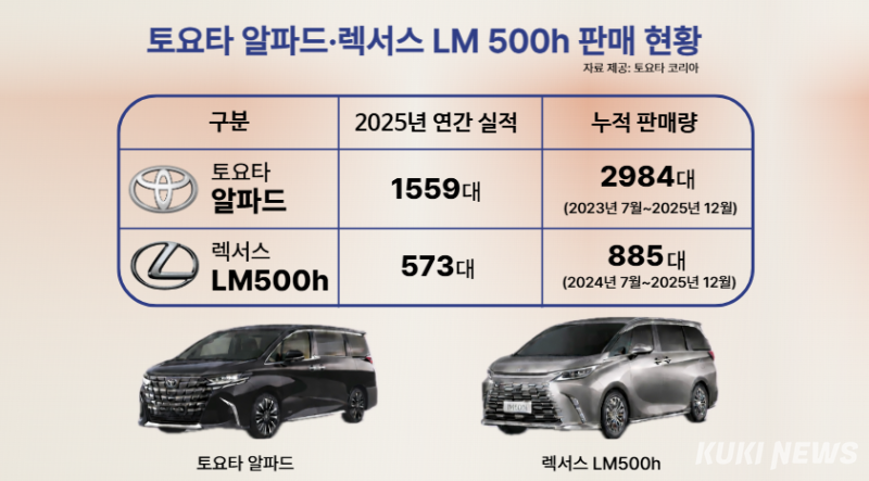 판매 실적도 뒷받침된다. 토요타 알파드는 지난 2023년7월 출시 이후 지난해 12월까지 누적 2984대가 팔렸다. 특히 지난해 한 해 동안만 1559대가 팔렸다. 렉서스 LM 500h는 지난 2024년 7월 출시 후부터 지난해 12월까지 누적 885대가 팔렸고, 2025년 연간 판매는 573대를 기록했다. 고가 모델임을 감안하면 적지 않은 수치다. 실제로 서울 강남 일대 타워가 및 학원가에서는 알파드와 LM을 곳곳에서 확인할 수 있었다.