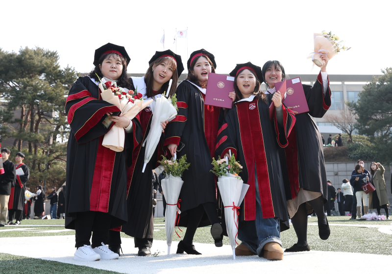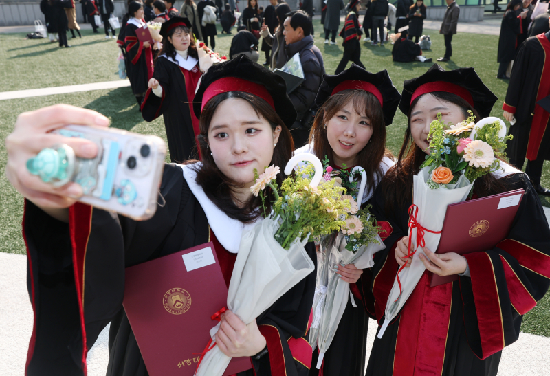 20일 서울 마포구 서강대학교에서 열린 2025학년도 전기 학위수여식에서 졸업생들이 기념촬영을 하고 있다.