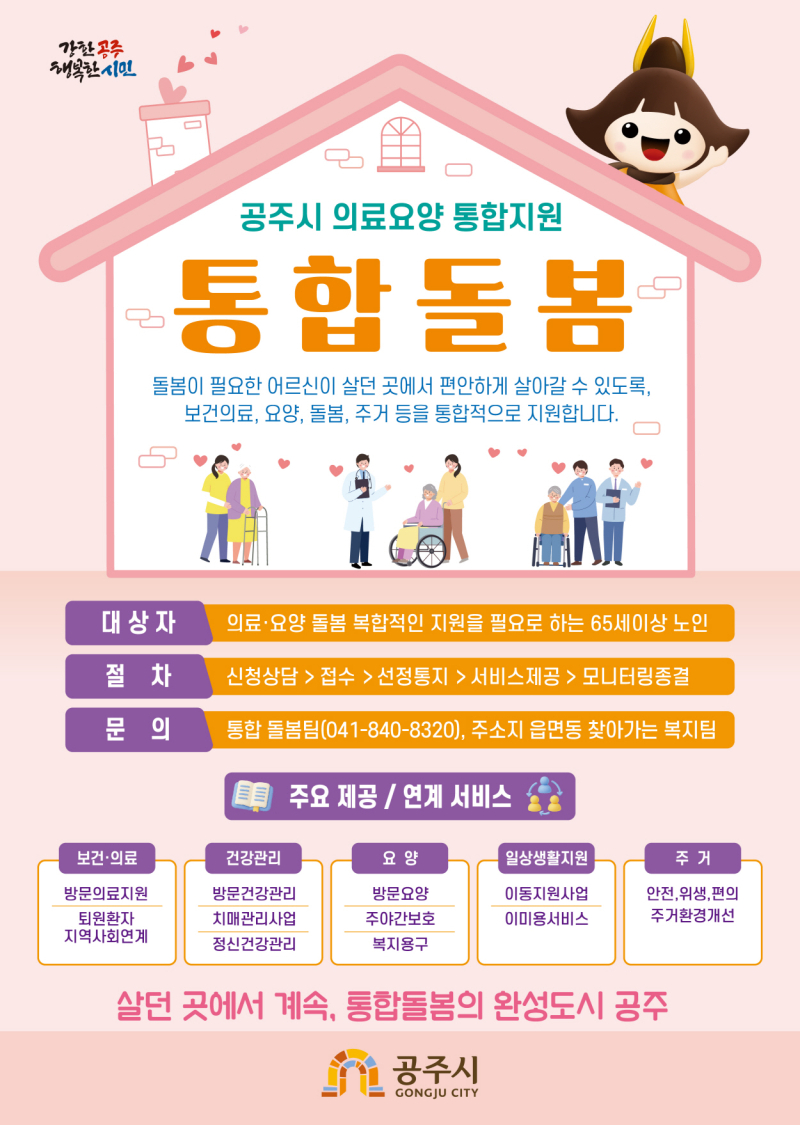 해당 사업은 공주시 통합돌봄 자체사업의 하나로, 의료기관 퇴원 이후 돌봄 이 필요한 노인과 중증 지체·뇌병변 장애인을 우선한다.