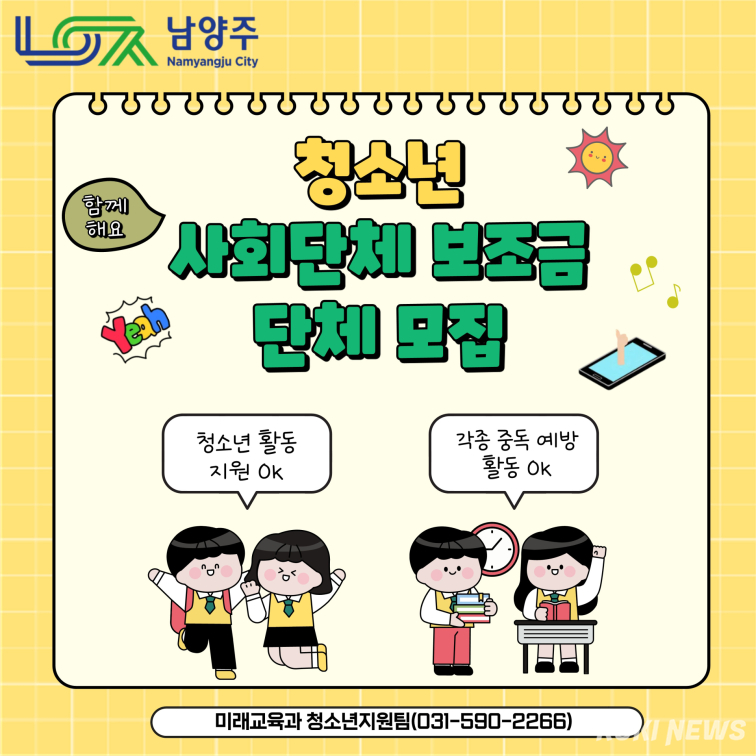 경기 남양주시는 청소년의 권리 증진과 다양한 활동 지원을 위해 다음 달 6일까지 ‘청소년 사회단체 보조금 공모사업’ 신청을 받는다고 20일 밝혔다.