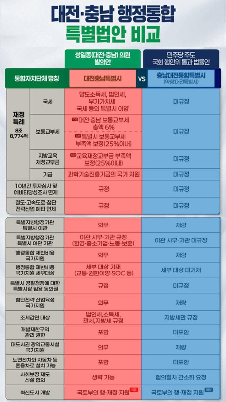 특히 행정통합 법안의 기준이 됐던 성일종 국민의힘 국회의원이 대표발의한 ‘대전충남특별시 설치 및 경제과학수도 조성을 위한 특별법안’에 대해서는 "차린 것은 많지만 먹을 것이 없는 종합선물세트"라는 말을 남겨 1년 넘게 준비해 온 김태흠 충남도지사와 이장우 대전시장, 행정통합 민관협의체 등을 자극했다.