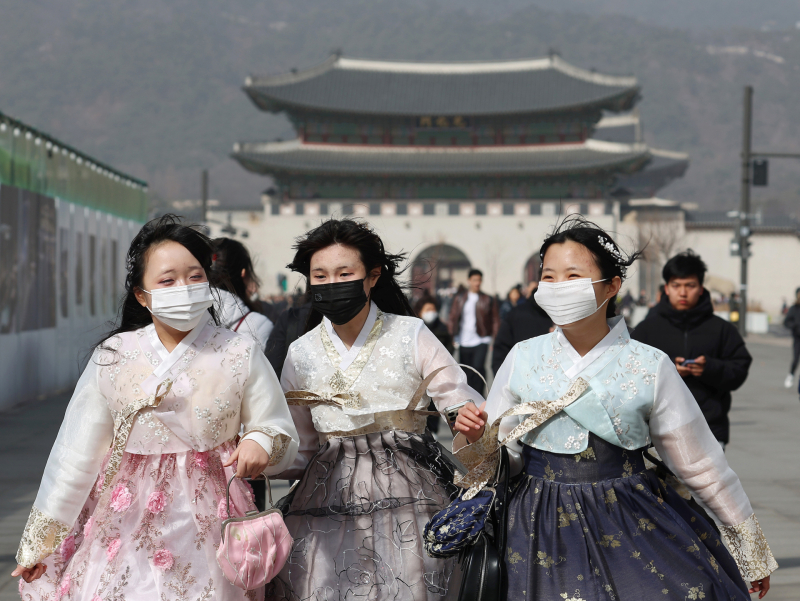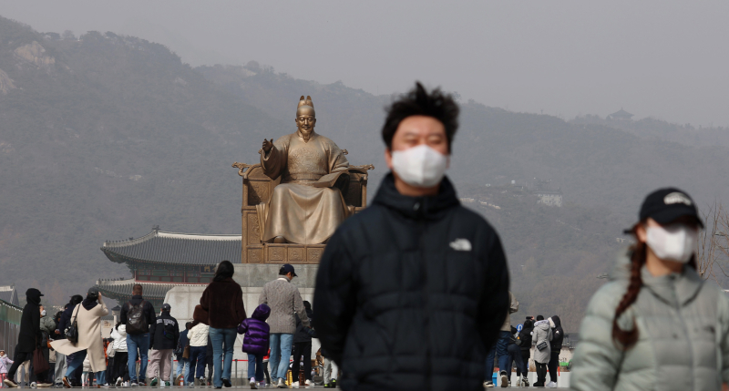 황사가 유입되며 수도권에 미세먼지 주의보가 내려진 22일 서울 광화문광장에서 시민들이 마스크를 착용한 채 걷고 있다. 미세먼지 주의보는 권역별 평균 농도가 150㎍/㎥ 이상 2시간 넘게 지속될 때 발령된다.