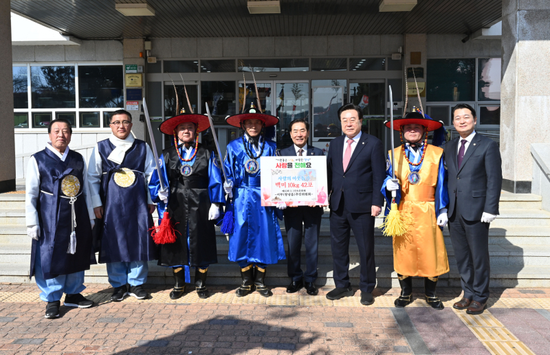 제65회 3․1민속문화제 서부(창녕읍) 추진위원회가 지신밟기 행사에 앞서 백미를 기탁하고 있다. 이번 쌀은 지난 11일 창녕읍 행정복지센터에서 열린 서부장군 추대식에서 지역 단체들이 축하의 뜻으로 전달한 물품을 한데 모은 것이다. 축하 화환과 격려 대신 실질적인 도움으로 마음을 보태자는 뜻이 모여 나눔으로 이어졌다.