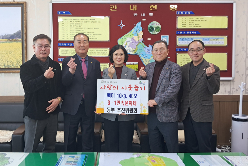 같은 날 남지읍에서도 훈훈한 나눔이 이어졌다. 제65회 3·1민속문화제 동부추진위원회(위원장 김진철)는 지역 내 어려운 이웃을 위해 쌀 10kg 40포를 기탁했다.