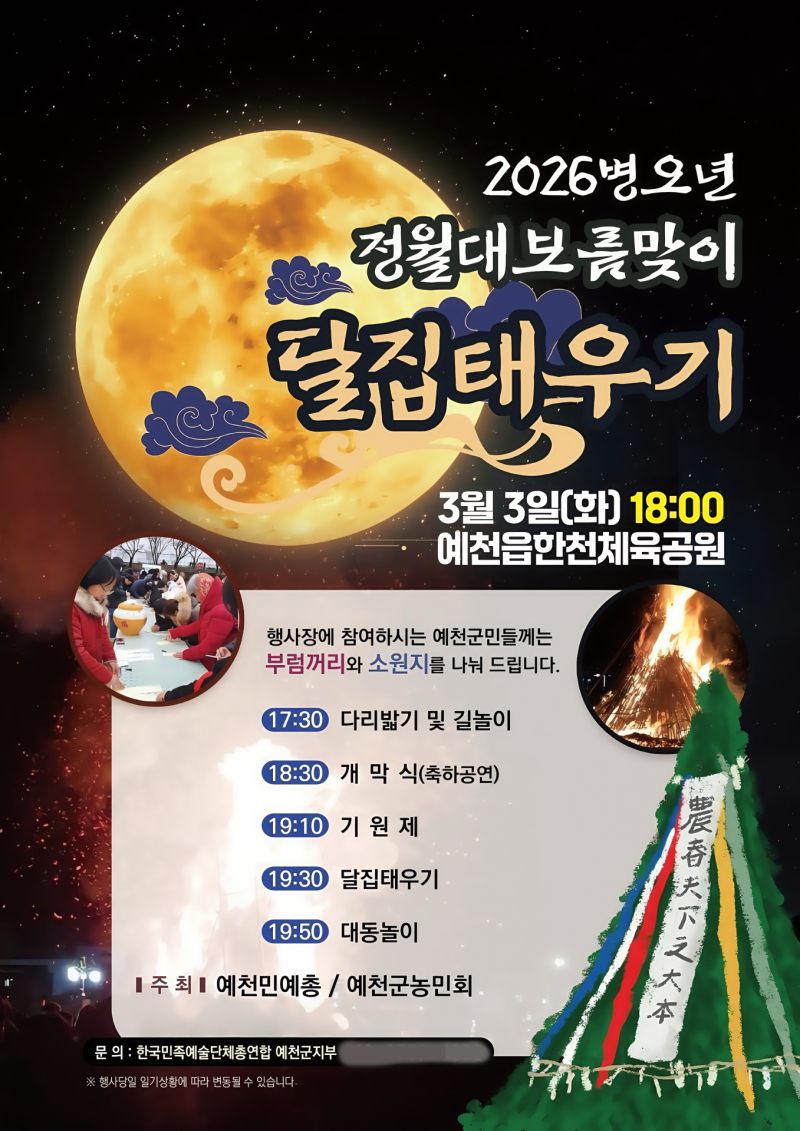 예천군이 병오년 정월대보름을 맞아 한천체육공원에서 달집태우기 행사를 열고 군민의 안녕과 지역 발전을 기원한다. 이번 행사는 전통 세시풍속을 계승하는 동시에 공동체 화합을 다지는 자리로 마련된다.