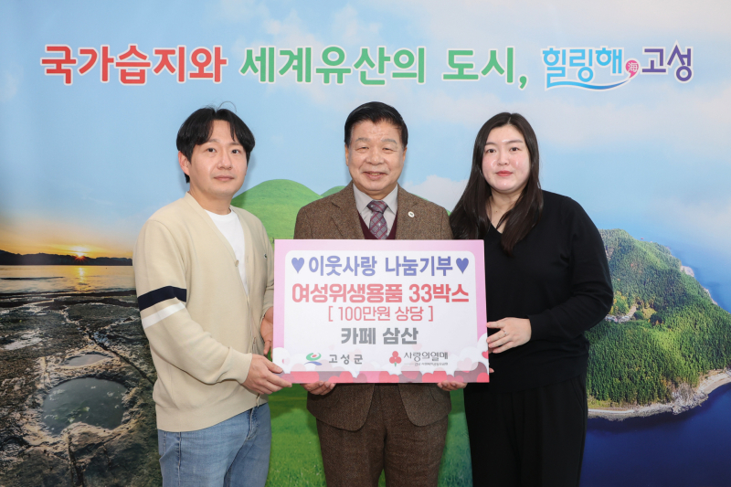삼산면 판곡리 소재 카페삼산 이민석·김은주 대표는 20일 고성군청을 방문해 저소득 다문화가정 여성을 위한 여성용품 33박스(100만 원 상당)를 기탁했다.