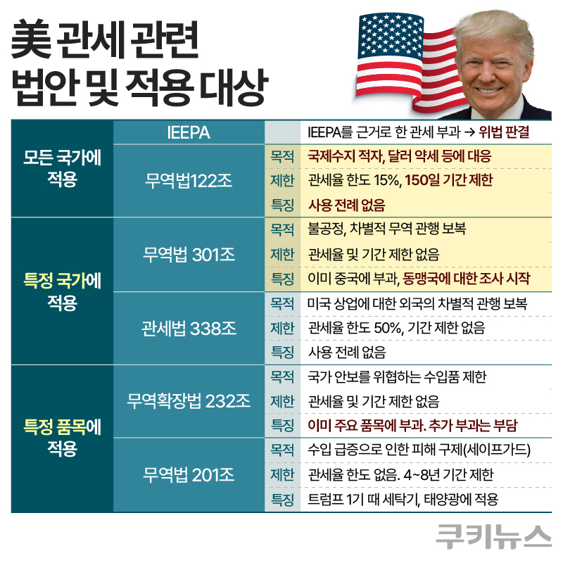 트럼프 대통령은 20일(현지시간) 10% 글로벌 관세를 선언한 뒤, 하루 만에 관세율을 15%로 상향하겠다고 발표했다. 이 조치는 오는 24일부터 발효돼 최장 150일까지 유지될 수 있으며, 이후 연장에는 의회의 동의가 필요하다. 동시에 트럼프 대통령은 무역법 301조(불공정무역 제재)와 관세법 338조, 안보를 이유로 특정 품목에 고율 관세를 부과할 수 있는 무역확장법 232조 등을 활용해 ‘더 강한 무역 규제’를 검토하겠다는 입장도 밝혔다.
