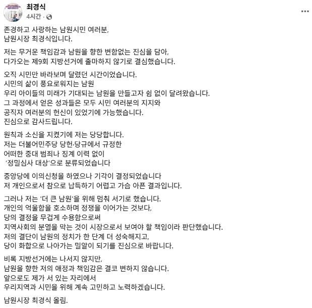 최 시장은 이날 페이스북을 통해 “무거운 책임감과 남원을 향한 변함없는 진심을 담아 제9회 지방선거에 출마하지 않기로 결정했다”고 전했다.