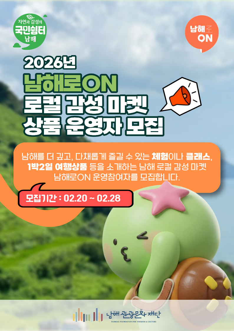 한편 남해로ON 로컬 감성 마켓 상품 운영자 모집과 관련한 자세한 사항은 재단 관광마케팅팀으로 문의하면 된다.
