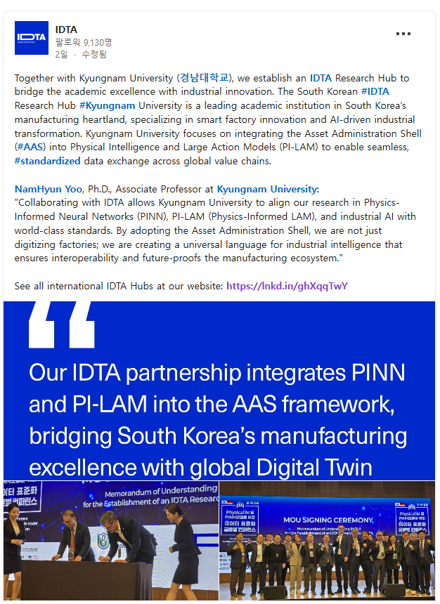 앞으로 경남대는 IDTA Research Hub Korea를 중심으로 제조 특화 피지컬 AI, PINN(물리정보신경망), PI-LAM(물리지능 거대행동모델) 기반 제조 데이터 및 온톨로지 표준화 연구를 본격 추진한다. 제조 현장에서 생성되는 AI·물리 데이터의 국제 표준 연계를 주도하며 글로벌 제조 데이터 생태계와의 협력도 강화할 계획이다.