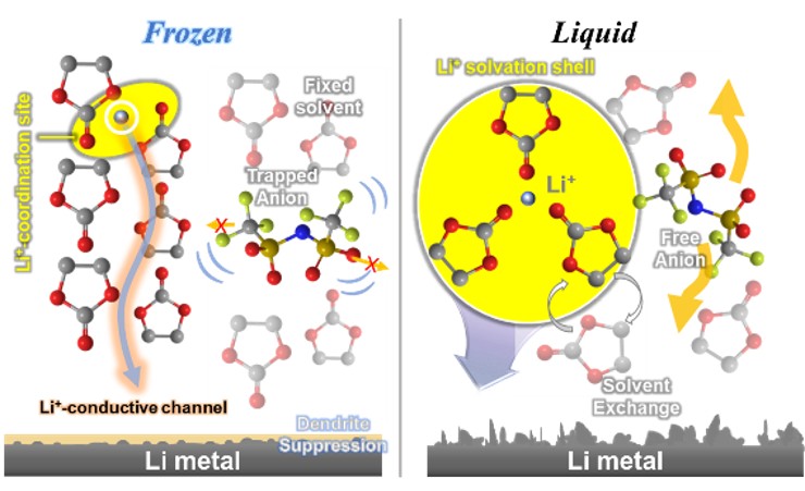 고체 전해질 없이 기존에 쓰던 액체 전해질을 얼리는 방법만으로 리튬금속배터리를 작동시킬 수 있음을 보여주는 연구 결과가 나왔다. 전해질이 얼면 배터리 충방전이 안 된다는 통념을 깨는 발견이다.