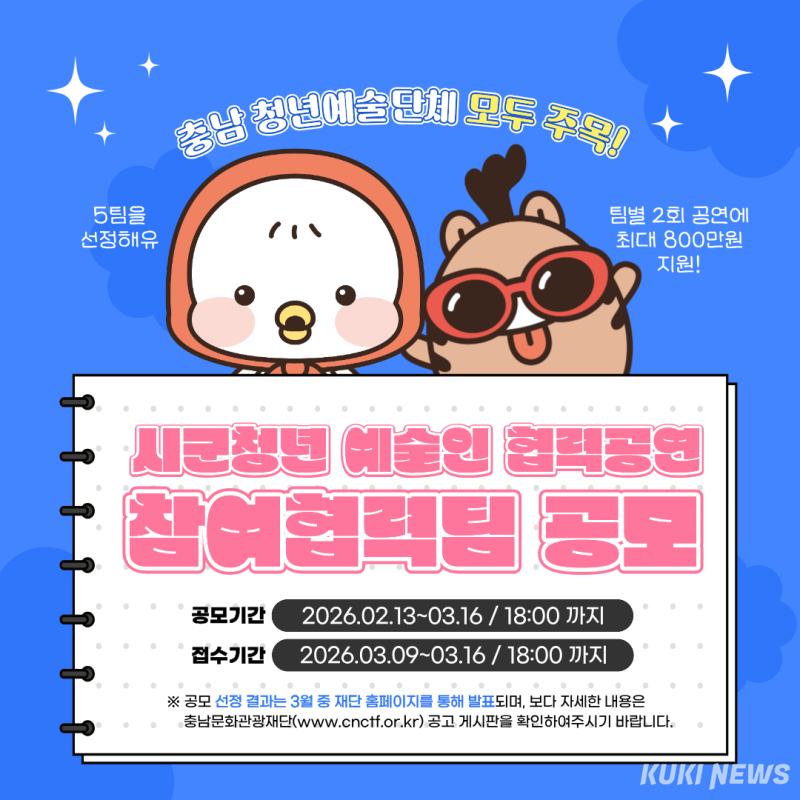 이번 공모는 충남 소재 청년 예술단체 2곳이 협력해 구성한 5팀을 선정하며, 팀별 2차례 공연을 통한 최대 800만원의 공연료를 지원한다.