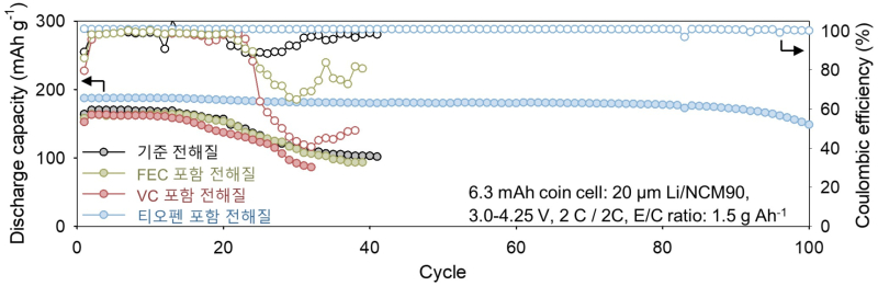 실험 결과 기존 배터리는 40회 정도 충·방전하면 수명이 급격히 줄었지만, 티오펜을 적용한 배터리는 100회 이상 반복해도 초기 용량을 안정적으로 유지했다.