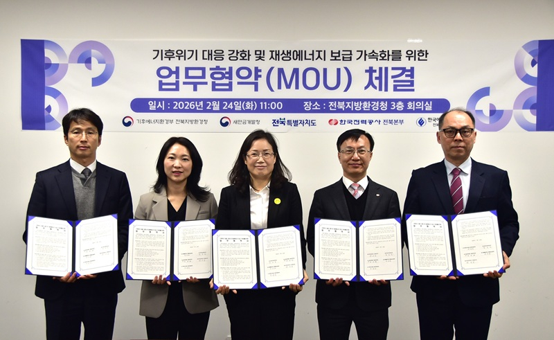 전북특별자치도는 24일 전북지방환경청, 새만금개발청, 한국전력공사 전북본부, 한국에너지공단 전북지역본부와 함께 전북지역 재생에너지 보급 가속화를 위한 업무협약(MOU)을 체결하고, 기후위기 대응 강화를 위한 본격 협력에 나섰다.