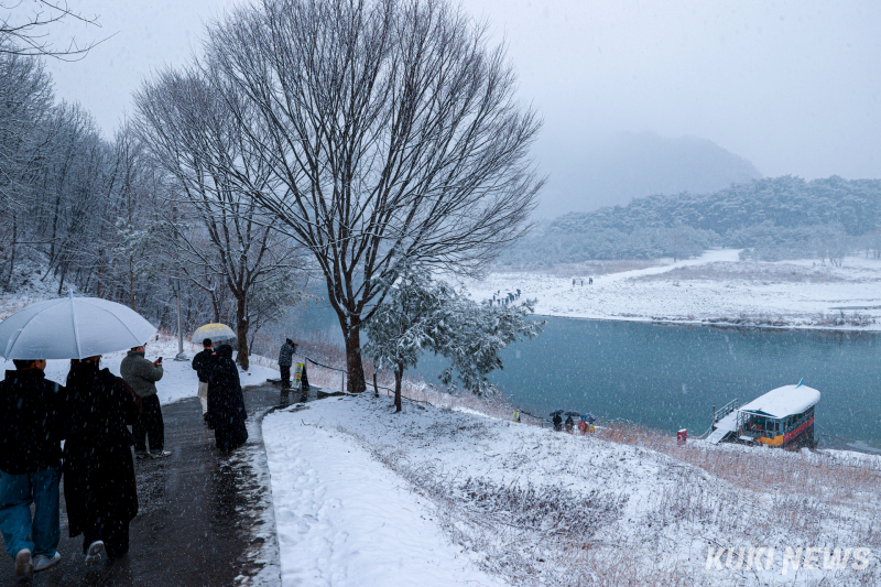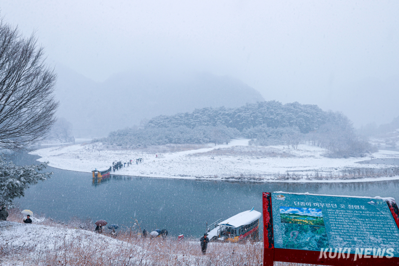 24일 강원 영월군 청령포에 눈이 내리며 섬 전체가 하얗게 뒤덮였다. 영화 '왕과 사는 남자' 흥행으로 단종 유배지에 대한 관심이 높아진 가운데, 이날도 관광객들이 도선을 타고 섬을 찾아 설경을 감상하고 있다.
