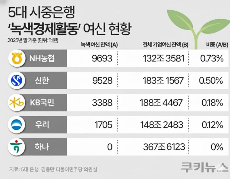 지난해 말 기준 5대 은행 모두 전체 기업 여신 중 녹색경제활동 비중은 1%를 밑돌았다. NH농협은 0.73%(9693억원), 신한은행 0.5%(9528억원), KB국민은행 0.18%(3388억원), 우리은행 0.12%(1705억원)에 그쳤다. 하나은행은 2025년 신규 취급액 기준 30억9000만원(0.003%)을 공급했지만, 잔액 기준으로는 0원(0%)으로 파악됐다.