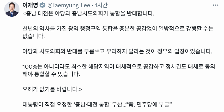 이 대통령은 이날 엑스(X·옛 트위터)에 ‘대통령이 직접 요청한 ‘충남·대전 통합’ 무산…“靑, 민주당에 부글”’이라는 제목의 언론 보도를 공유하며 “오해가 없기를 바란다”며 이같이 반박했다. 해당 보도는 더불어민주당이 대전·충남 통합 추진에 소극적이어서 청와대 내부에 불편한 분위기가 감지되고 있다는 내용이다.