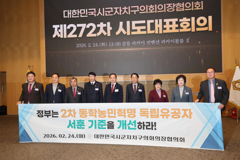 대한민국시군자치구의회의장협의회(회장 김현기)가 지난 24일 강원도 강릉 라카이 컨벤션에서 열린 제272차 시도대표회의에서 2차 동학농민혁명 참여자의 독립유공자 서훈 인정을 위한 법령 개정을 촉구했다.