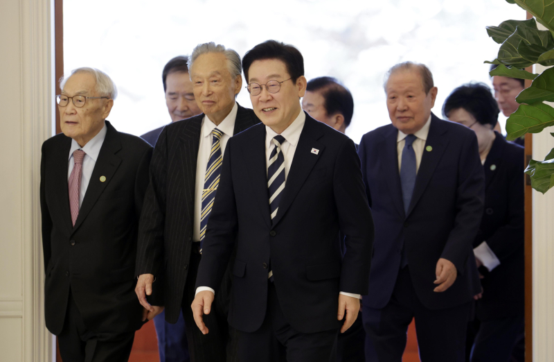 이 대통령은 고문단을 향해 “수없이 많은 경험과 경륜에서 나온 고견을 말씀해주시면 국정에 참고하겠다”며 조언을 구했다. “일찍 모셨어야 했는데 늦어서 아쉽고 죄송하다. 앞으로 자주 모시고 말씀을 듣겠다”고도 했다.