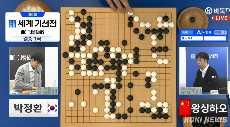 이날 승리로 박정환 9단은 왕싱하오 9단과 상대 전적도 2승2패로 균형을 맞췄다. 결승3번기 기선을 제압한 박 9단은 26일 오후 2시에 속행하는 2국에서 승리한다면 매년 개최되는 세계 바둑대회 중 최고 상금(4억원)을 자랑하는 기선전 우승을 차지하게 된다.