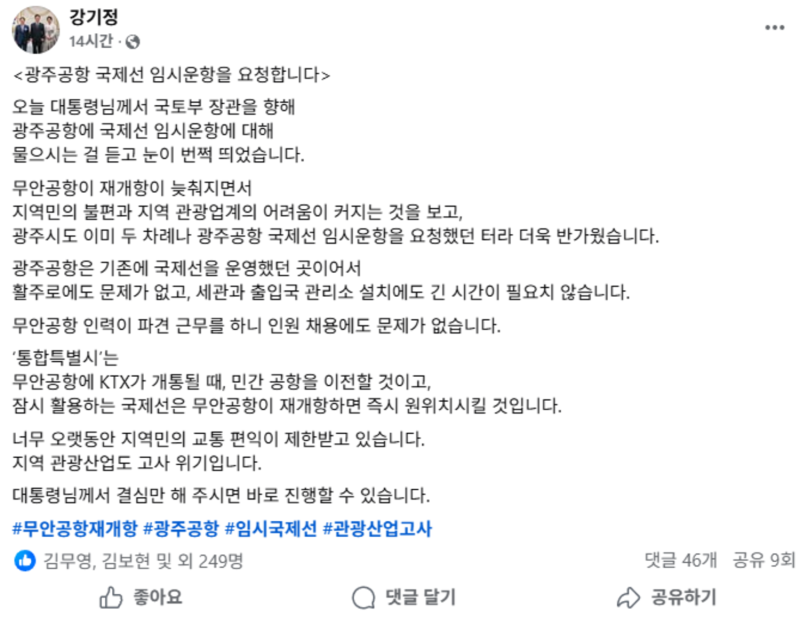 이에 강기정 광주시장은 페이스북 통해 대통령의 결단을 촉구하며 광주공항 국제선 임시 운항 카드를 다시 꺼내 들었다. 강 시장은 “광주공항은 활주로와 세관, 검역 등 국제선 운영에 필요한 기반 시설이 이미 갖춰져 있어 긴 시간이 필요치 않다”며 국토부의 부정적 기류에 정면으로 반박했다.