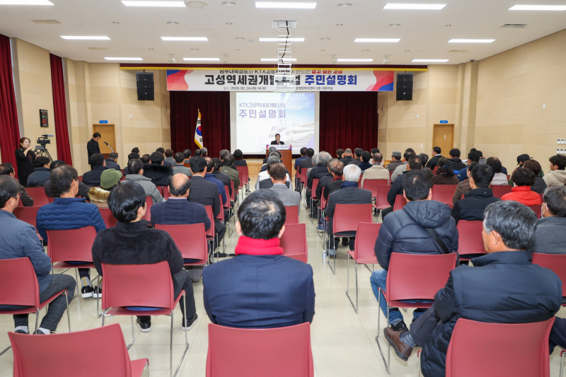 경남 고성군(군수 이상근)은 지난 24일 고성읍행정복지센터에서 지역 주민과 관계자 등이 참석한 가운데 KTX 고성역세권 개발사업 주민설명회를 열었다.