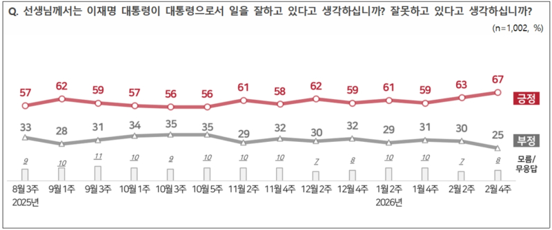 이재명 대통령의 국정 운영을 긍정 평가한 비율이 67%에 달한다는 여론조사 결과가 26일 발표됐다. 같은 기관이 시행한 조사에서 취임 후 가장 높은 기록이라는 평가다.