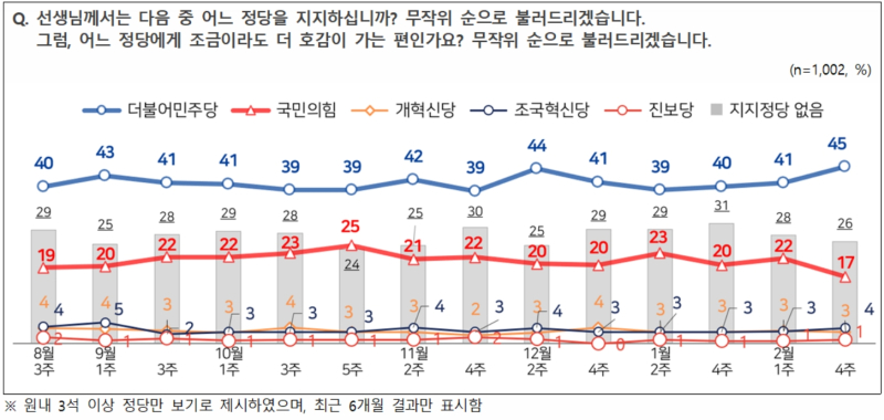 같은 조사에서 더불어민주당과 국민의힘의 정당 지지도는 각각 45%, 17%로 집계됐다.