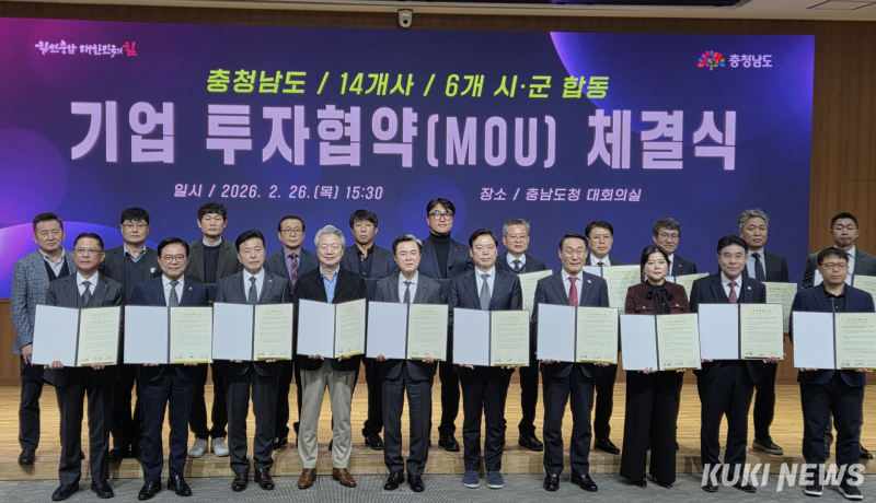 김태흠 지사는 26일 도청 대회의실에서 김석필 천안시장 권한대행 등 6개 시군 단체장 또는 부단체장, 이동주 성창오토텍 대표이사 등 14개 기업 대표와 투자협약을 체결했다.