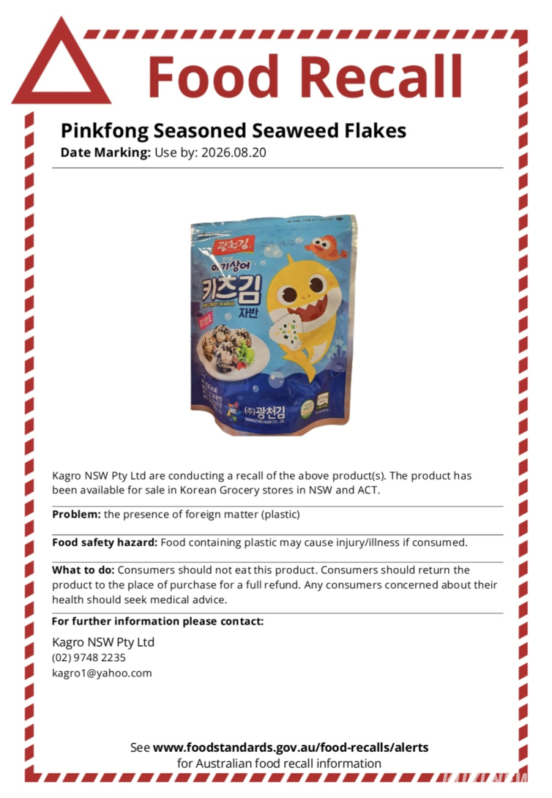 호주·뉴질랜드식품기준청(FSANZ)은 지난 25일(현지 시간) 홈페이지를 통해 ‘Pinkfong Seasoned Seaweed Flakes 40g(핑크퐁 키즈김 자반)’ 제품에 대한 리콜 공지를 게시했다.