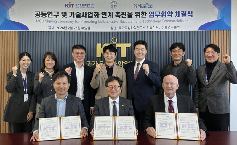 국가독성과학연구소(KIT)는 25일 KIT 전북첨단바이오연구본부에서 미국 Mayo Clinic, ㈜유닉과 ‘글로벌 오픈이노베이션 협력을 통한 공동연구 및 기술사업화 연계 업무협약’을 체결했다.