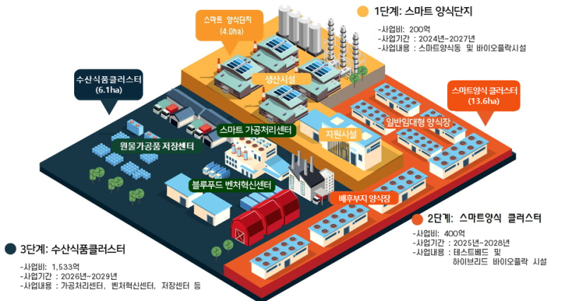 생산시설·지원시설·부대시설 건립인 1단계에 이어 수산양식기업 임대 및 투자유치인 2단계, 가공처리센터·벤처혁신센터·저장물류센터 구축이 3단계에 속한다.